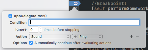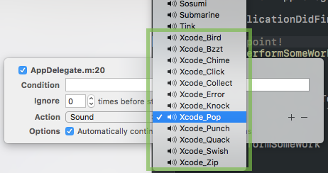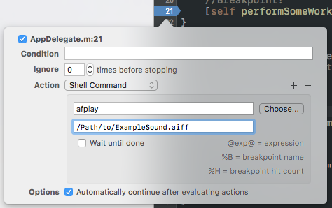 Another powerful audio breakpoint tool that should be mentioned is Apple's text-to-speech, which can be easily leveraged from Xcode breakpoints by using the Shell Command action along with the system say command.