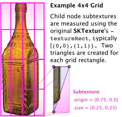 We start by adding a new parent node with the same position, z-position, and z-rotation as the original sprite. This will act as the root parent for all child nodes. Each child SKSpriteNode is given a subtexture using SKTexture(rect:,in:) based on the X,Y grid coordinate in the coordinate space of the original texture. In most cases the original SKTexture will have a -textureRect of (0,0)-(1,1). An example of how the subtexture rectangle is calculated is shown in the image to the right. Once the grid coordinates are iterated and all of our nodes are created, we can then calculate the animation properties.
