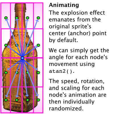 In a previous post I presented an approach for creating a disintegration effect using Apple's SpriteKit framework, in which text appeared to blow apart in the wind. While working on a recent game project, I needed something a bit more dramatic: explosions.
