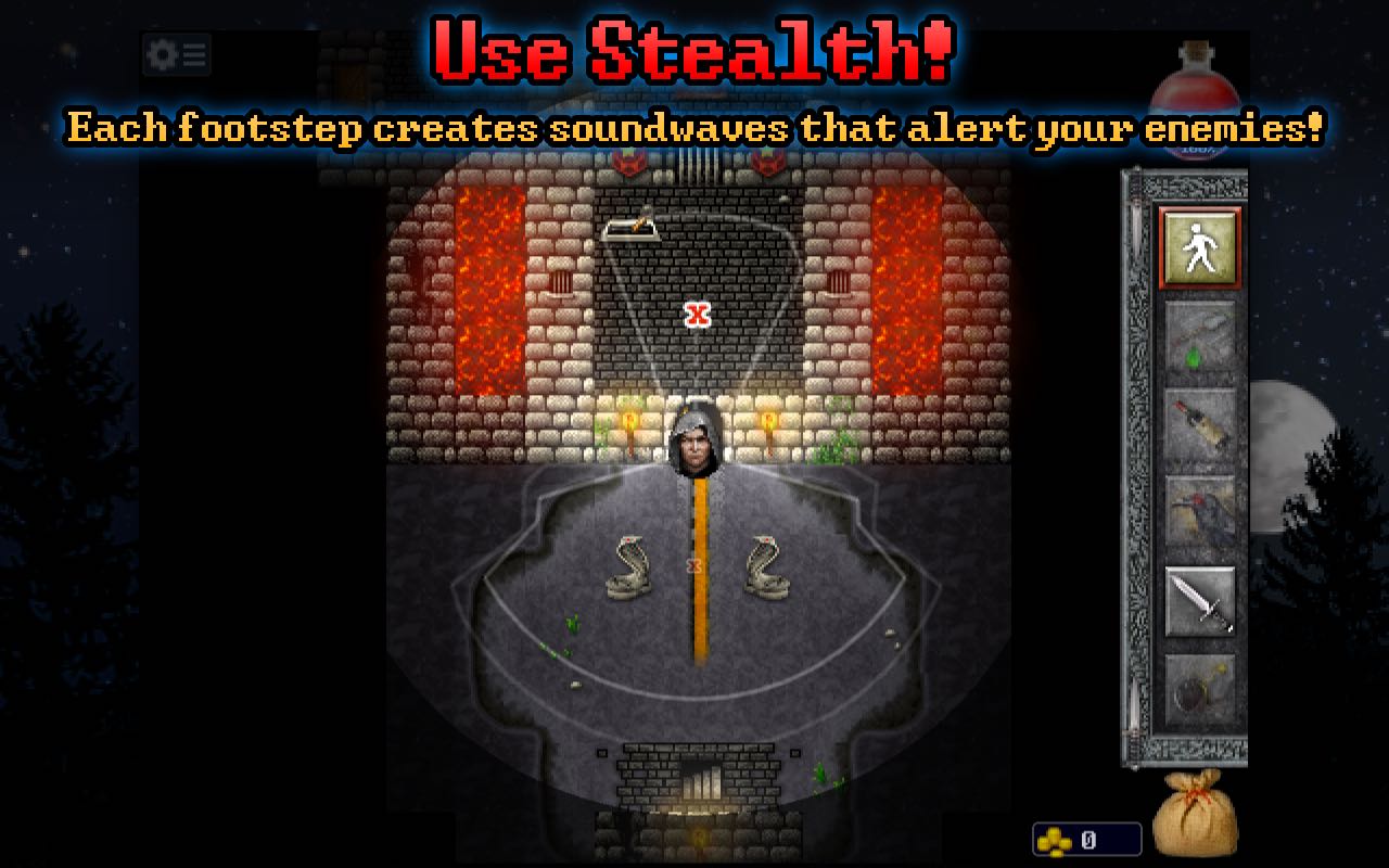 Unique stealth mechanics: observe the sound waves from your footsteps, and how they deflect from nearby obstacles.